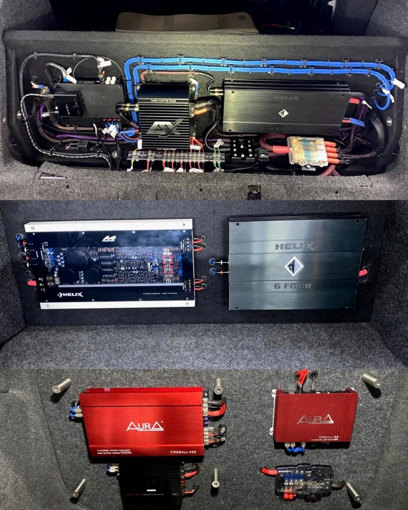 Right speakers, amps, and subwoofers placed for maximum output.
